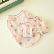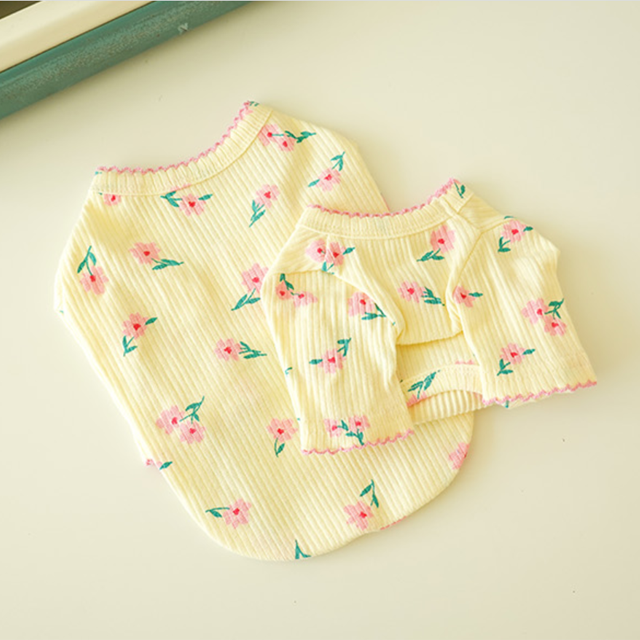 ピンフラワープリントトップス。春夏らしいパステルカラーの薄手の素材に可愛い花柄がプリントされています、袖口とネックラインに入った花柄と同色のメロー始末もワンポイント、伸縮性のある素材でストレスなく着用できます。