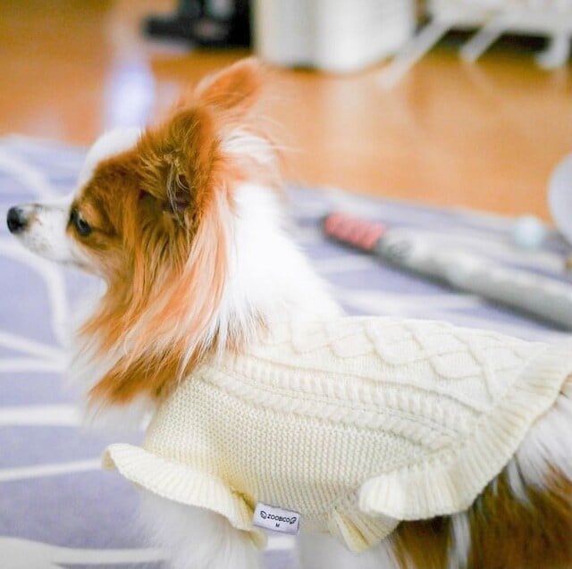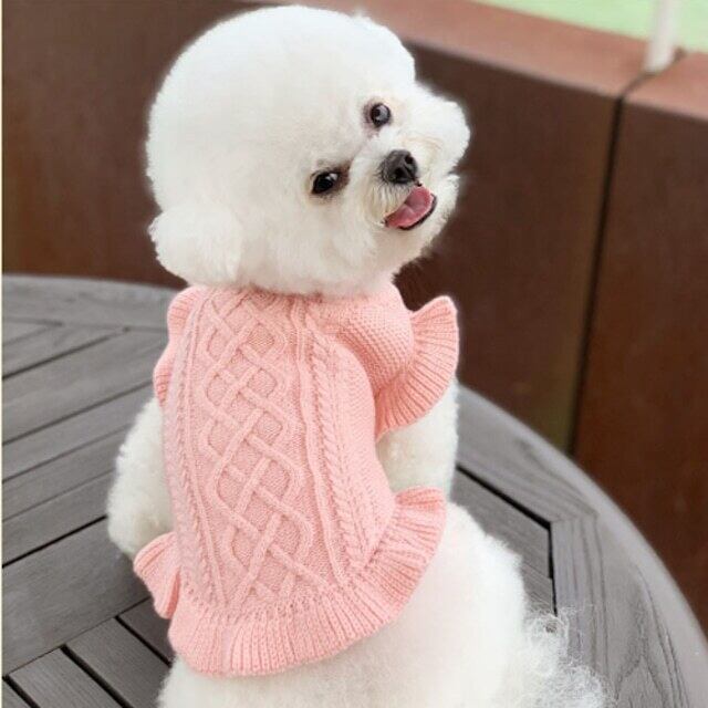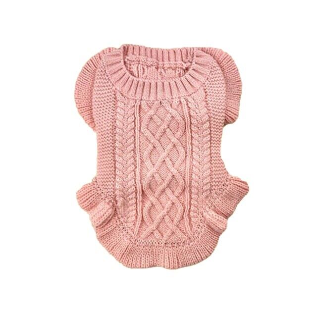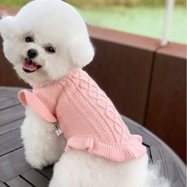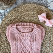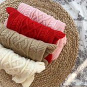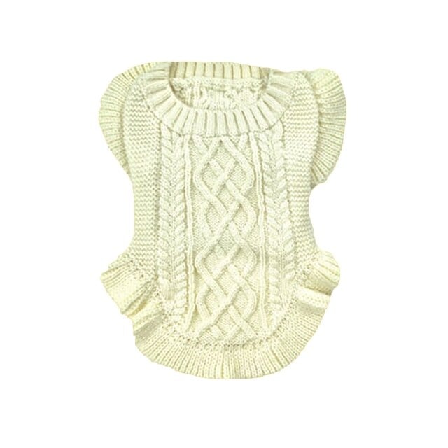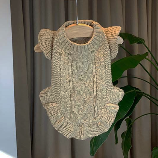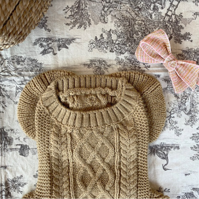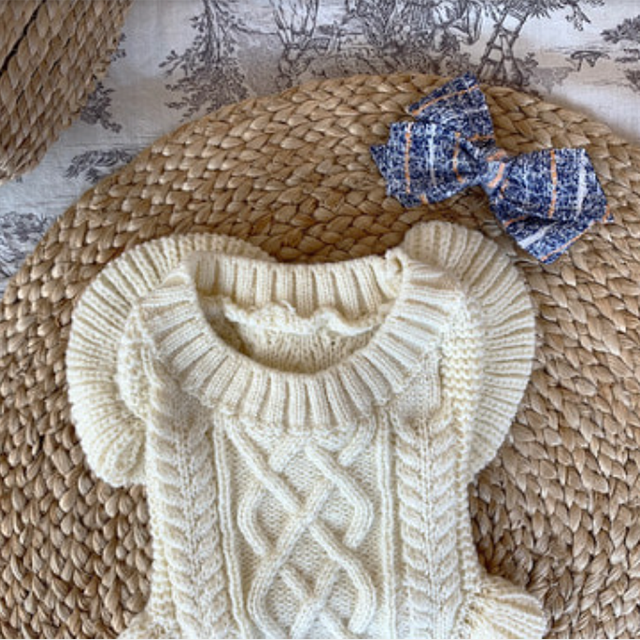 ローゲージのケーブル模様編みがソフトな風合いのニット。衿は丸首でスッキリ、袖と裾にはリブのフリルがキュートなデザインのニットトップスです。